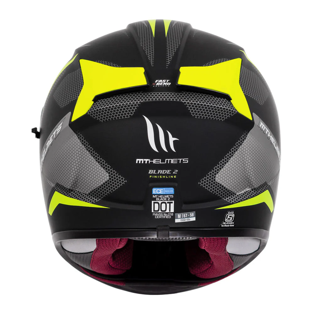 The MT Blade 2 SV Finishline Matt Fluro Yellow Helmet meets three global safety standards: ISI 2015 (India), ECE R-22.05 (Europe), and DOT (USA). Its SHARP 4-star rating serves as a testament to the structural integrity and its ability to provide world-class protection on every journey.